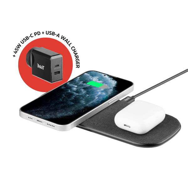 3sixT 15W + 15W Dual Wireless Charging Pad with Bonus 45W Charger- Black