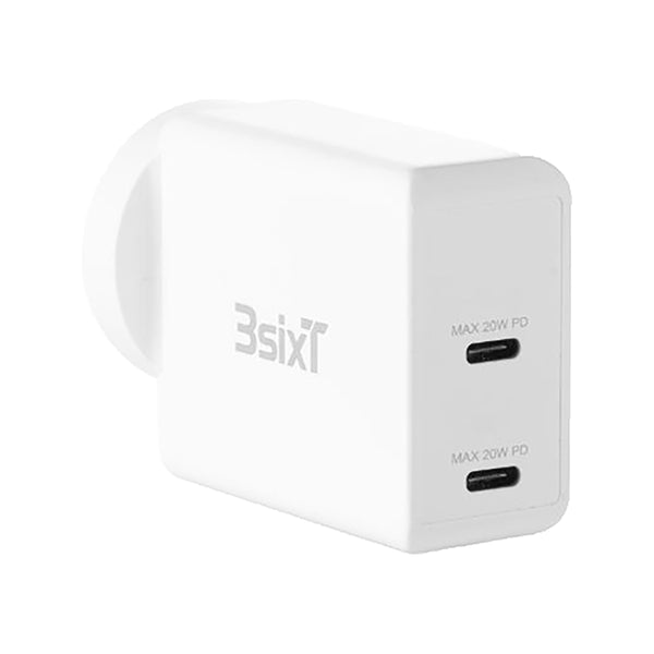3sixT Wall Charger AU 40W Dual USB-C PD20W + PD20W for Mobile Phones - White